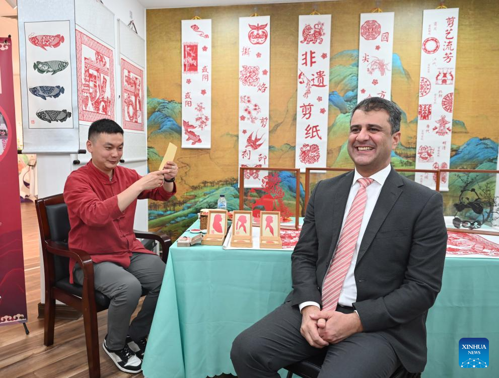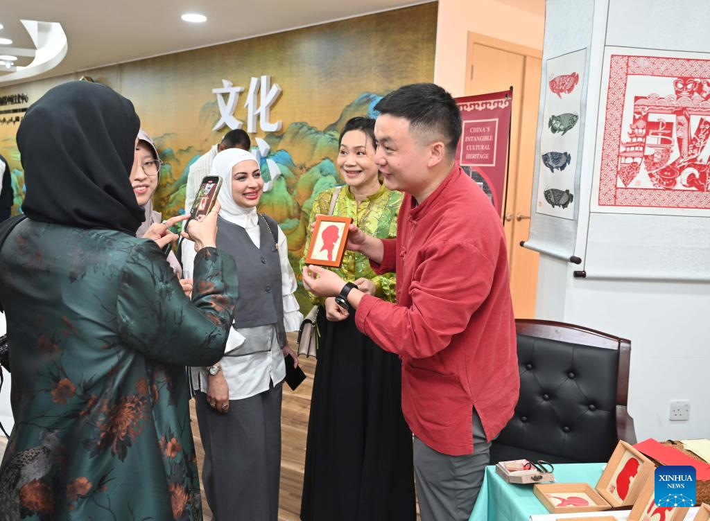 A Chinese paper-cutting artist communicates with visitors at the China Cultural Center in Kuwait, Hawalli Governorate, Kuwait, Oct. 12, 2025. The official inauguration ceremony for the Chinese Cultural Center in Kuwait was held here on Sunday, marking the full operation of the Gulf region's first Chinese cultural center. (Photo by Asad/Xinhua)