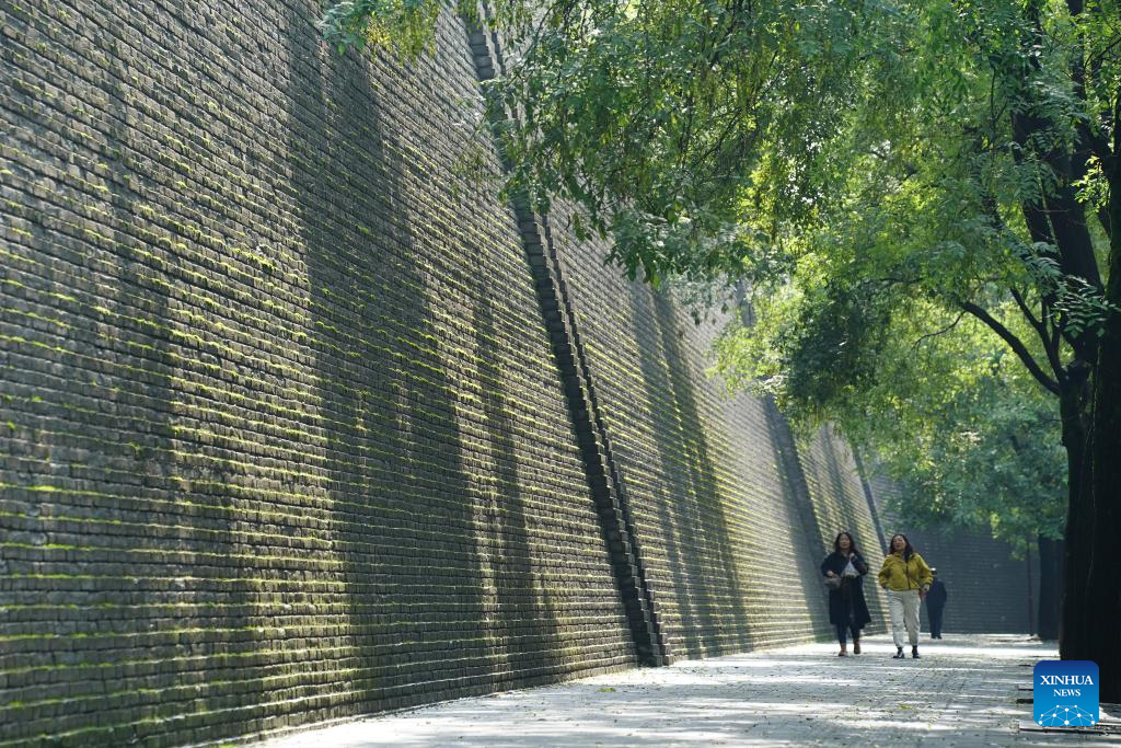 People walk along the city wall in Xi'an, northwest China's Shaanxi Province, Oct. 13, 2025. After the continuous autumn rain, moss and other plants have covered the city wall with a green coat, attracting people to watch and take photos.