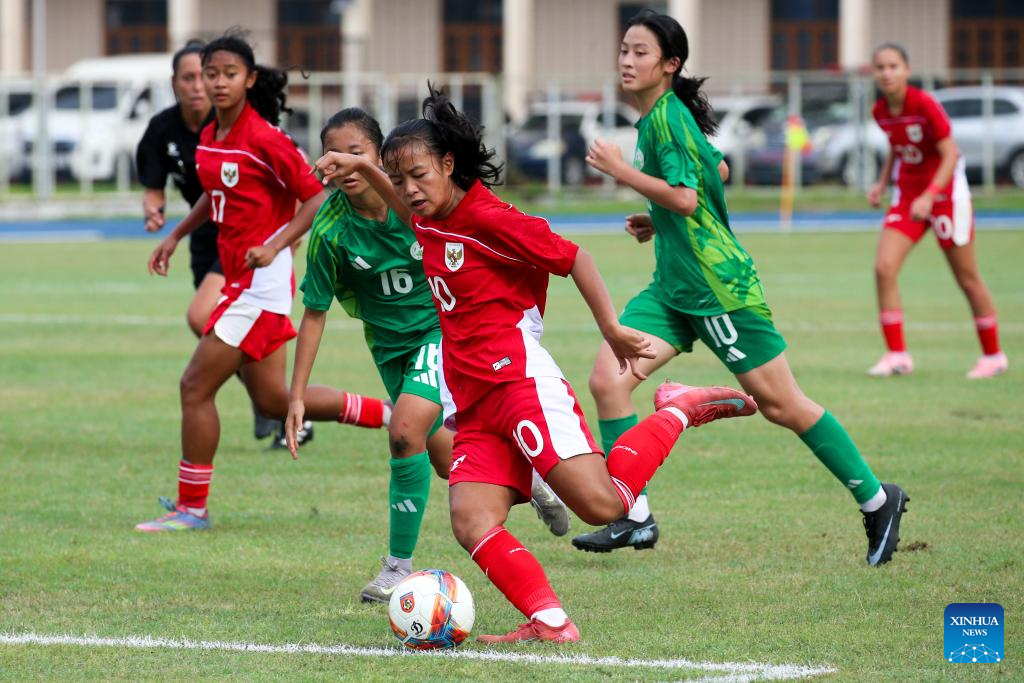Nafeeza Ayasha Nori (front) of Indonesia competes during the AFC U17 Women's Asian Cup 2026 China 2026 qualifier between China's Macao and Indonesia in Yangon, Myanmar, Oct. 13, 2025. (Xinhua/Myo Kyaw Soe)