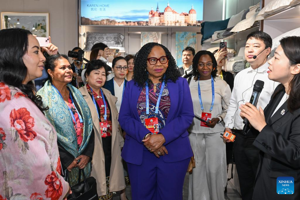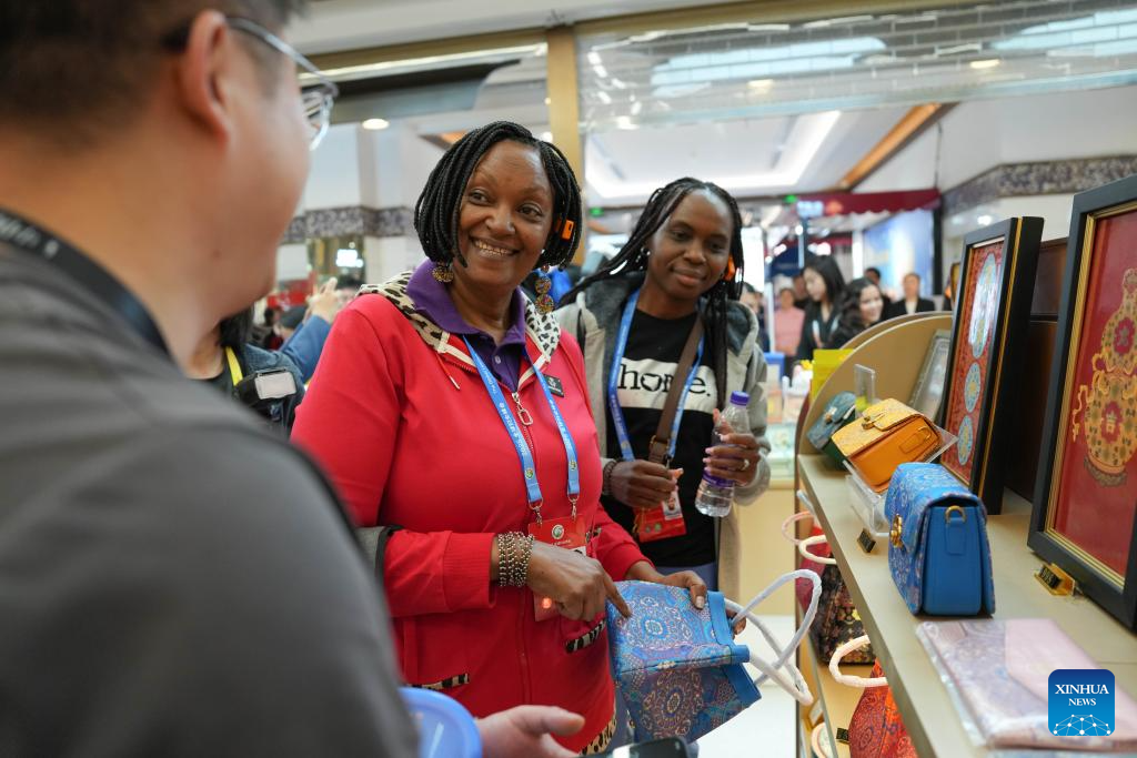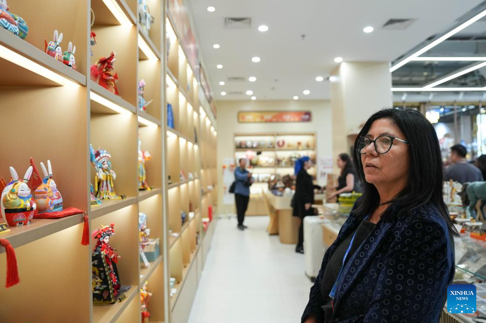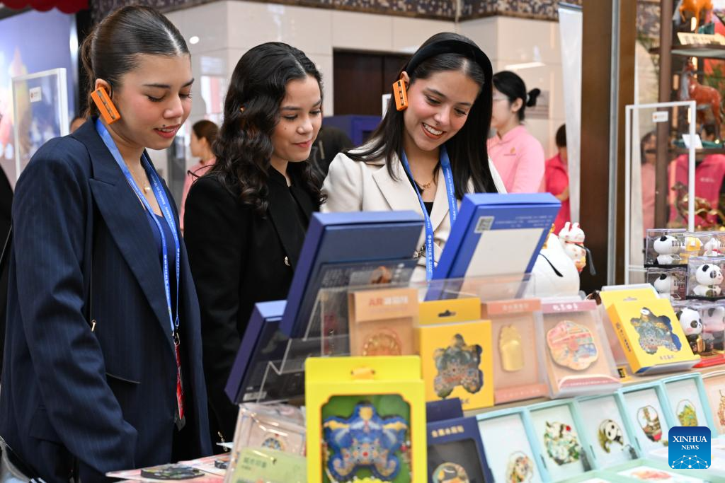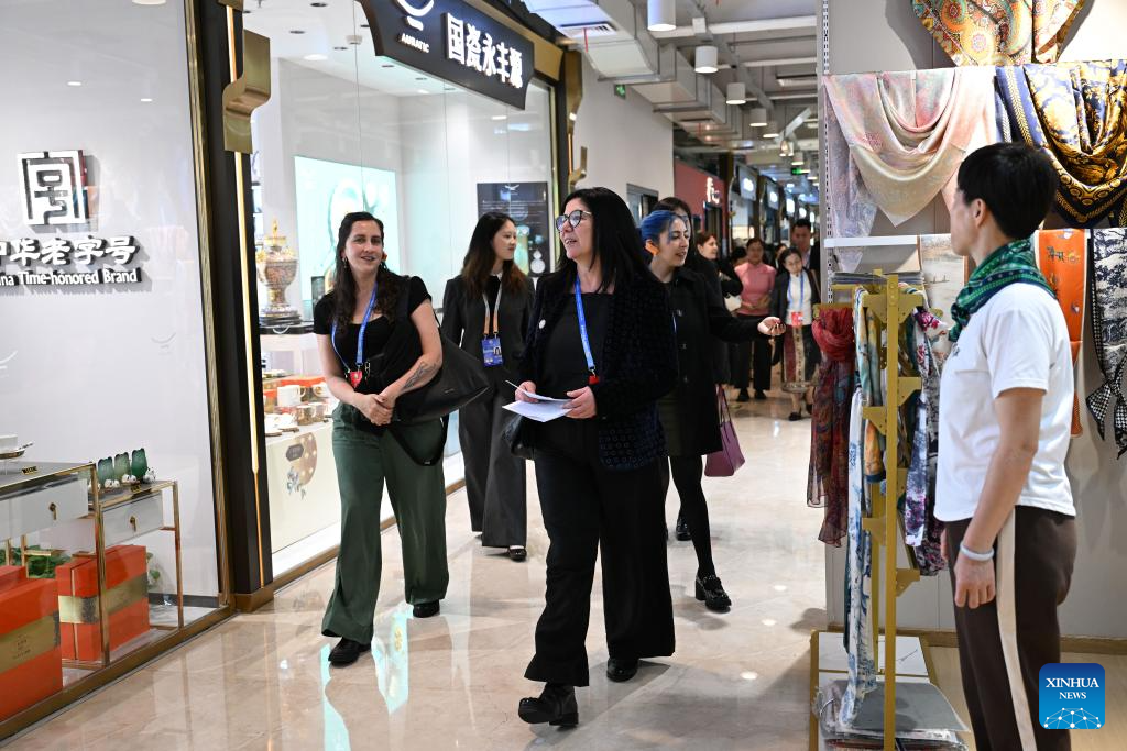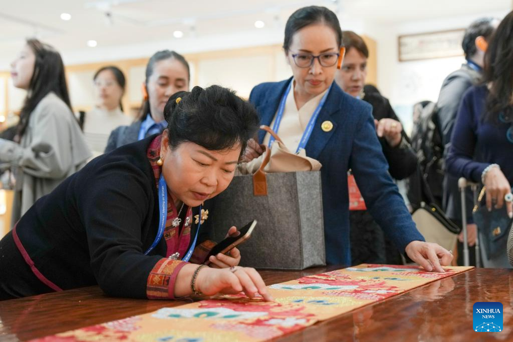 Representatives, who are in Beijing for the Global Leaders' Meeting on Women, learn about cultural and creative products while visiting the Silk Street building in Beijing, capital of China, Oct. 14, 2025. (Xinhua/Zou Jingyi)