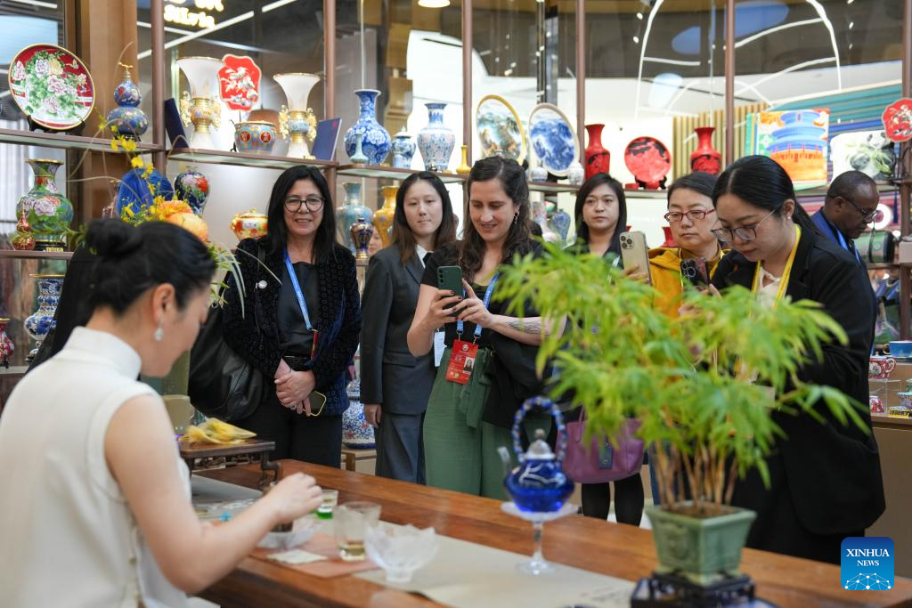 Representatives, who are in Beijing for the Global Leaders' Meeting on Women, watch a tea art display while visiting the Silk Street building in Beijing, capital of China, Oct. 14, 2025. (Xinhua/Xu Bingjie)