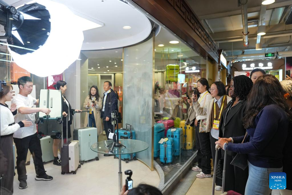 Representatives, who are in Beijing for the Global Leaders' Meeting on Women, watch a demonstration of live-streaming e-commerce while visiting the Silk Street building in Beijing, capital of China, Oct. 14, 2025. (Xinhua/Xu Bingjie)