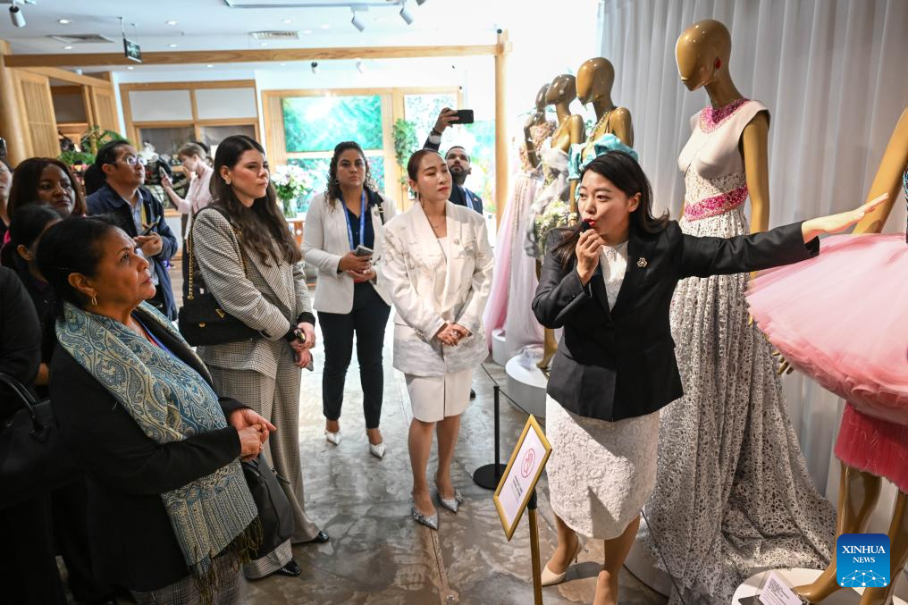 Representatives, who are in Beijing for the Global Leaders' Meeting on Women, learn about haute couture garment while visiting the Silk Street building in Beijing, capital of China, Oct. 14, 2025. (Xinhua/Zou Jingyi)