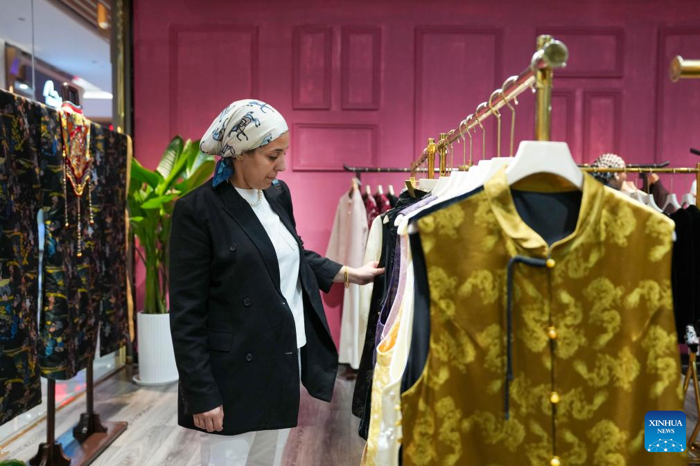 A representative, who is in Beijing for the Global Leaders' Meeting on Women, learns about neo-Chinese-style clothes while visiting the Silk Street building in Beijing, capital of China, Oct. 14, 2025. (Xinhua/Xu Bingjie)
