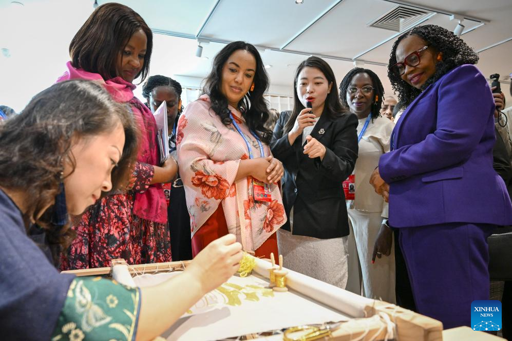 Representatives, who are in Beijing for the Global Leaders' Meeting on Women, learn about Beijing Embroidery while visiting the Silk Street building in Beijing, capital of China, Oct. 14, 2025. (Xinhua/Zou Jingyi)