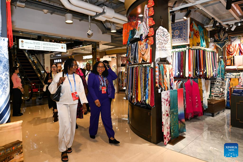 Representatives, who are in Beijing for the Global Leaders' Meeting on Women, visit the Silk Street building in Beijing, capital of China, Oct. 14, 2025. (Xinhua/Zou Jingyi)