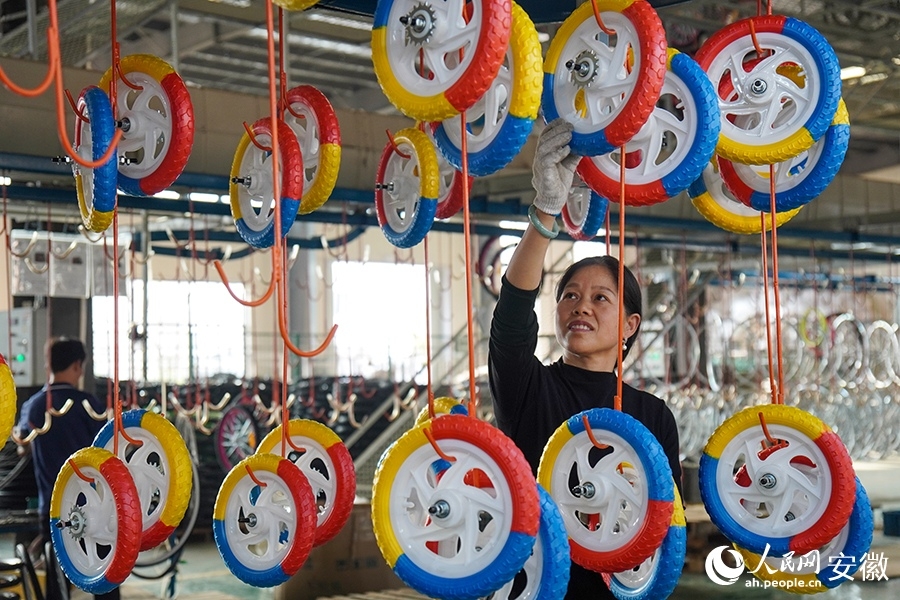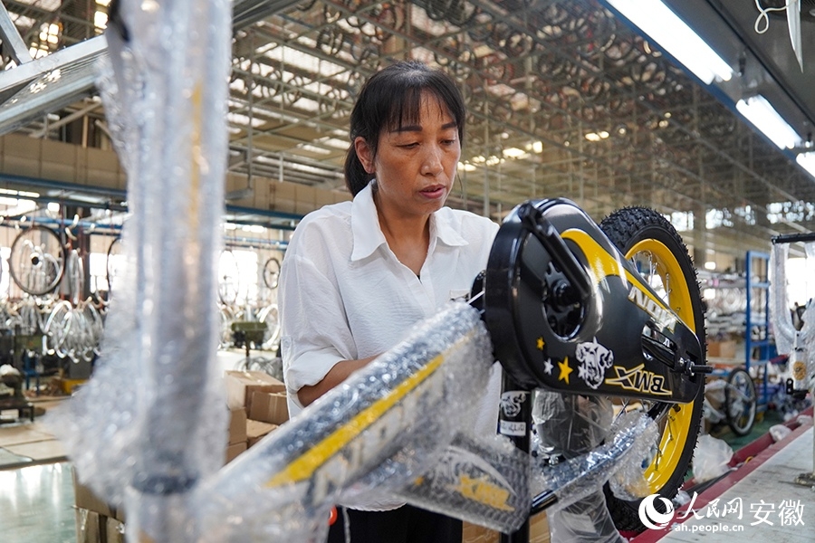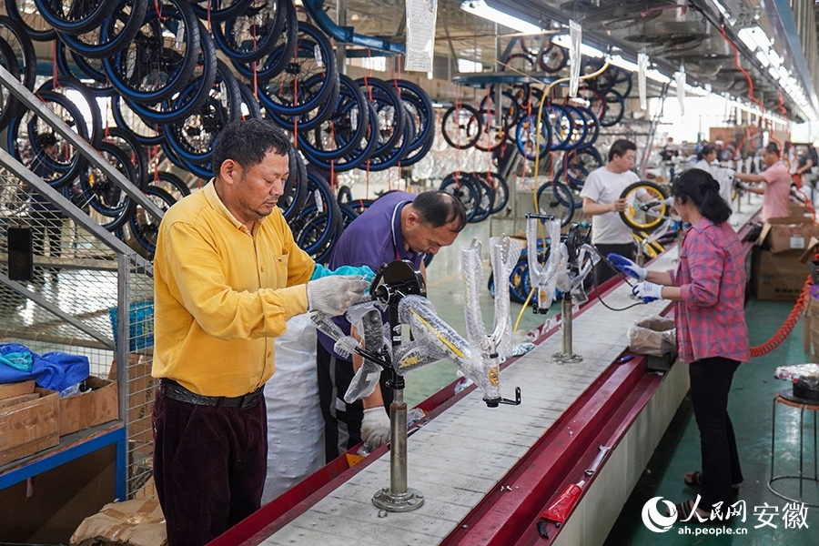 A worker assembles bicycles at a workshop in the bicycle industrial park in Wuhe county, Bengbu city, east China's Anhui Province. (People's Daily Online/Chen Ruotian)