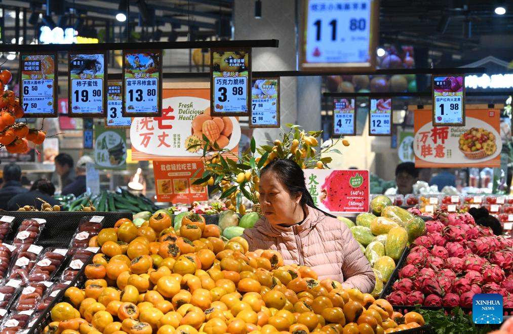 A customer selects fruits at a supermarket in Handan City, north China's Hebei Province, Oct. 15, 2025.(Photo by Hao Qunying/Xinhua)