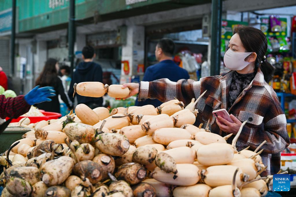 A customer selects vegetable at a market in Nanjing City, east China's Jiangsu Province, Oct. 15, 2025.(Photo by Fang Dongxu/Xinhua)