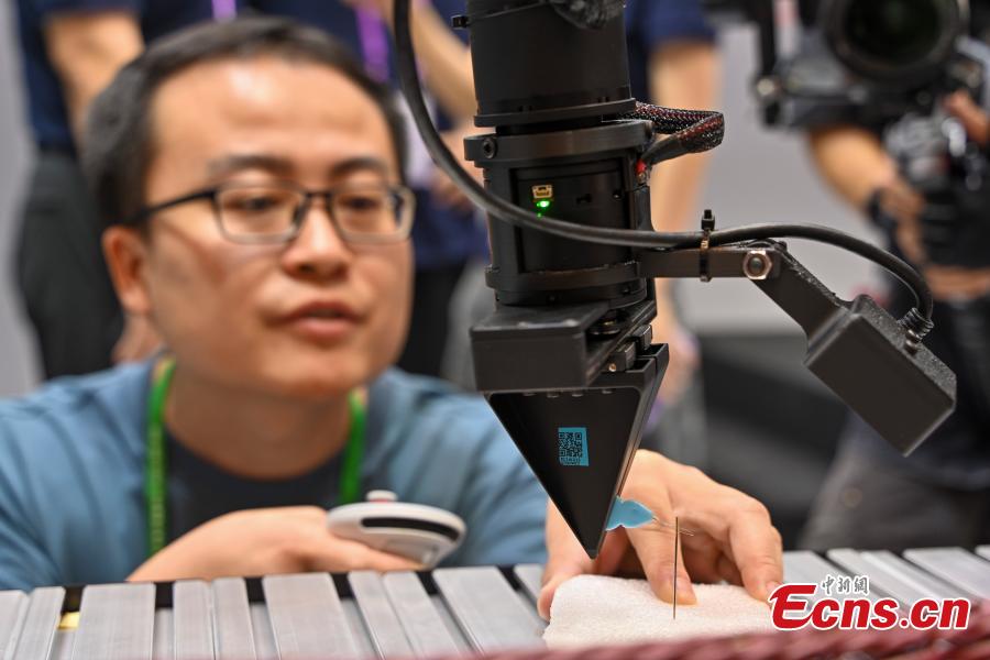 An exhibitor manipulates a smart flexible robotic arm to thread a needle at the 138th edition of the China Import and Export Fair in Guangzhou, Guangdong Province, Oct. 15, 2025. (Photo: China News Service/Chen Jimin)