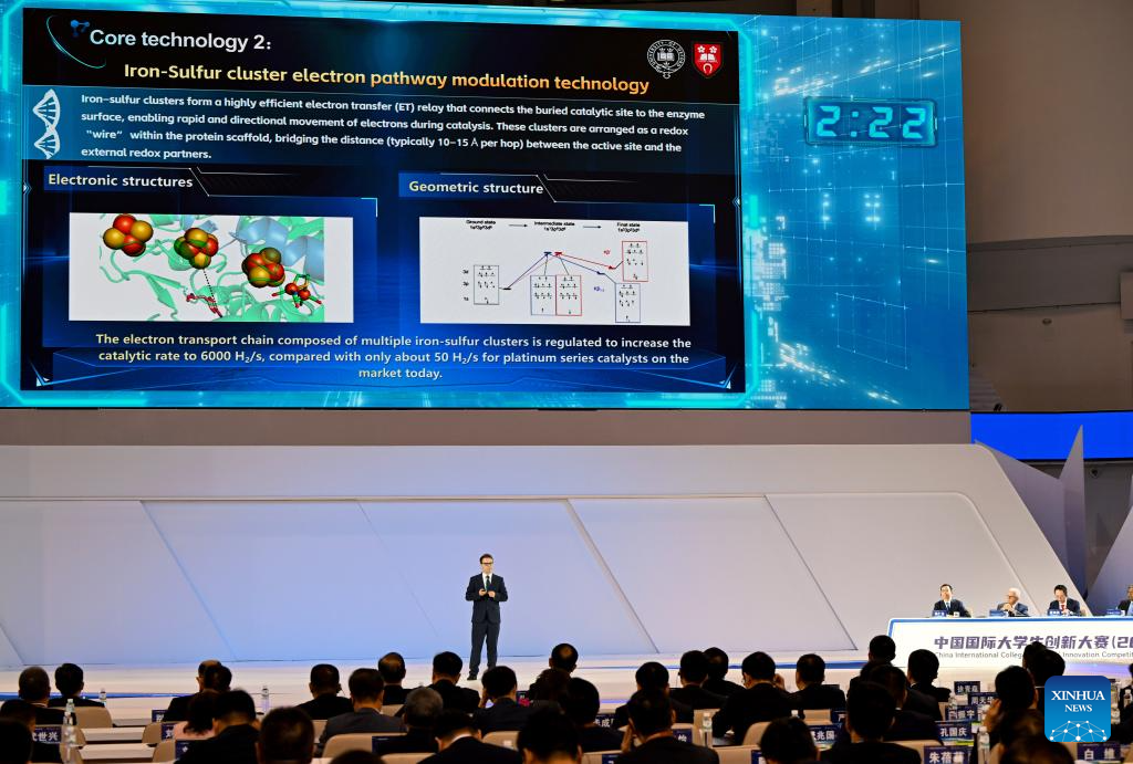 A contestant introduces the project of Oxford University during the final of the China International College Students' Innovation Competition 2025 in Zhengzhou, central China's Henan Province, Oct. 15, 2025. Six teams from domestic and international colleges took part in the final of the competition here on Wednesday. (Xinhua/Hao Yuan)