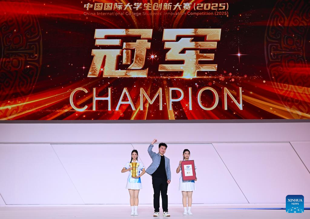 The project of Tsinghua University wins the final of the China International College Students' Innovation Competition 2025 in Zhengzhou, central China's Henan Province, Oct. 15, 2025. Six teams from domestic and international colleges took part in the final of the competition here on Wednesday. (Xinhua/Hao Yuan)