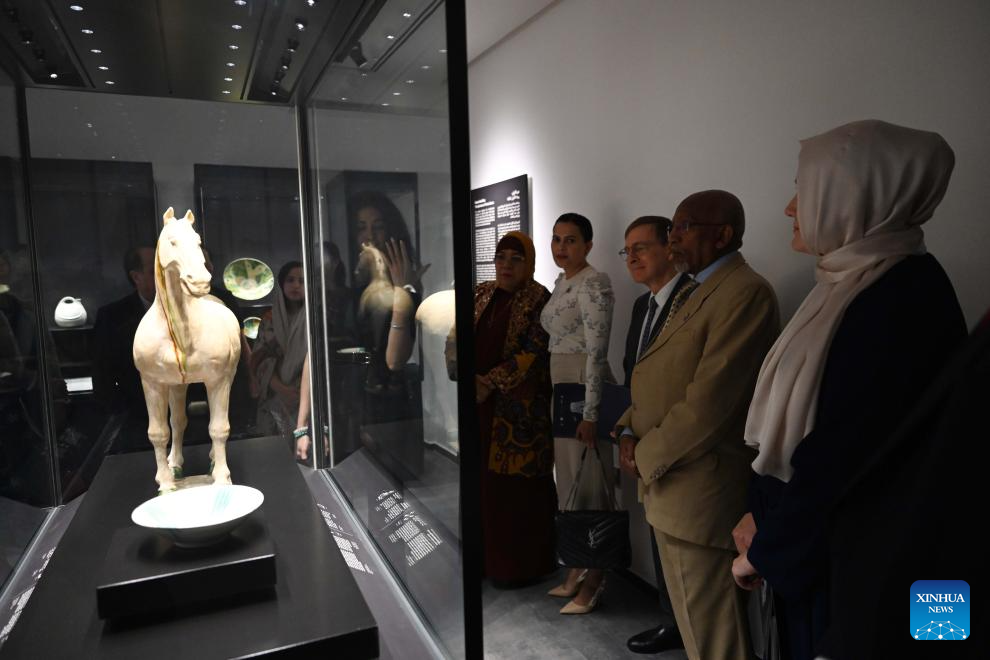 People visit the exhibition in Kuwait City, Kuwait, Oct. 15, 2025. The Chinese art exhibition "Distant and Close" opened on Wednesday at Kuwait's Dar al-Athar al-Islamiyyah, or House of Islamic Antiquities, a major public museum in Kuwait City. The exhibition, running through 2026, showcases the historical and cultural ties between China and Kuwait. (Photo by Asad/Xinhua)