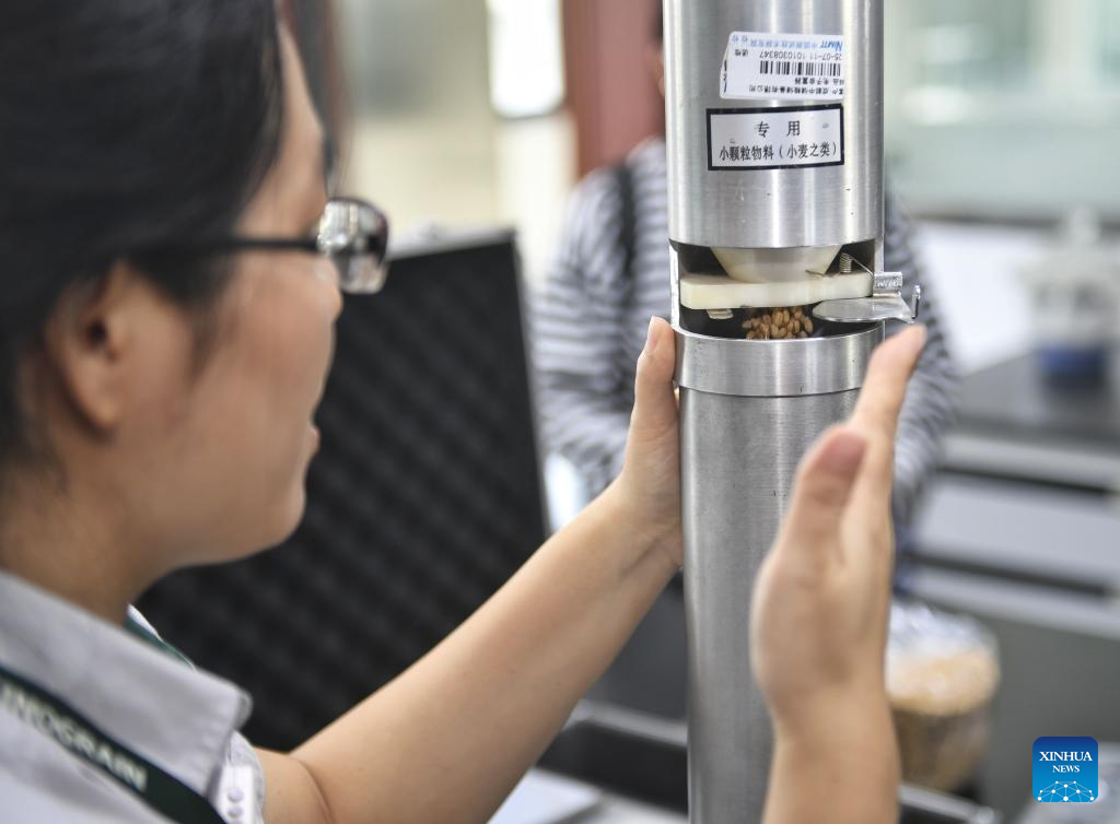 A technician measures unit weight of inbound grain for grading at a branch company of China Grain Reserves Group (Sinograin) in Chengdu, southwest China's Sichuan Province, Oct. 15, 2025.