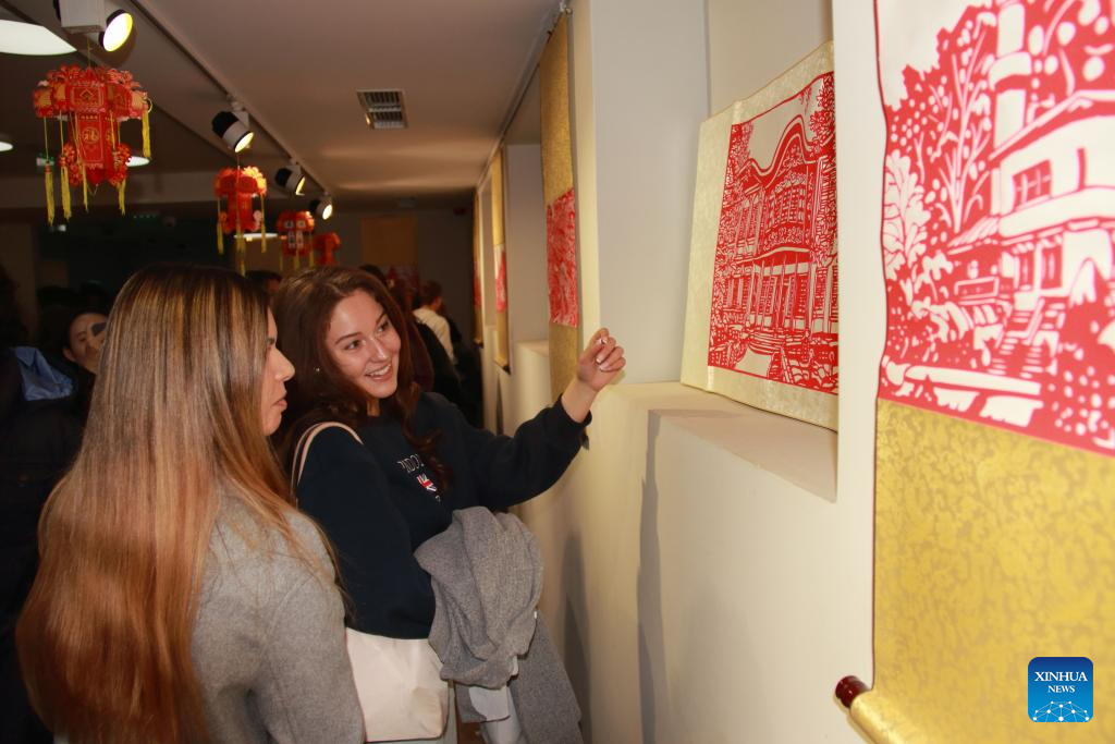 Visitors view posters with some of the images and texts included in the book "101 Paintings from Bulgaria" at its launch in Sofia, Bulgaria, on Oct. 16, 2025. The launch event for the bilingual book "101 Paintings from Bulgaria" was held at the Confucius Institute in Sofia here on Thursday. The book features 101 images of Bulgaria's most significant historical and architectural landmarks, depicted in traditional Chinese paper-cutting by a young Chinese artist, with accompanying texts in both Chinese and Bulgarian. (Photo by Marian Draganov/Xinhua)