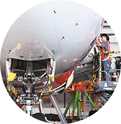A technician examines an aircraft at the one-stop aircraft maintenance base of Hainan Free Trade Port in south China's Hainan Province. (Xinhua/Yang Guanyu)