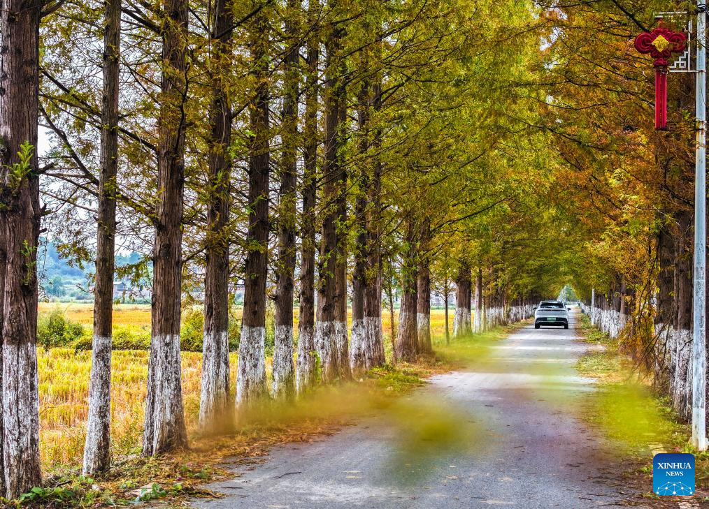 A drone photo taken on Oct. 19, 2025 shows the autumn scenery in Changjiang Village of Changning City, central China's Hunan Province. People are heading outdoors to enjoy the pleasant autumn days across China. (Photo by Zhou Xiuyuchun/Xinhua)