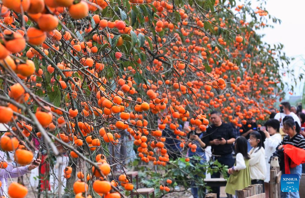 People look at persimmon trees in Tangjiaba Village of Leshan City, southwest China's Sichuan Province, on Oct. 19, 2025. People are heading outdoors to enjoy the pleasant autumn days across China. (Photo by Li Huashi/Xinhua)