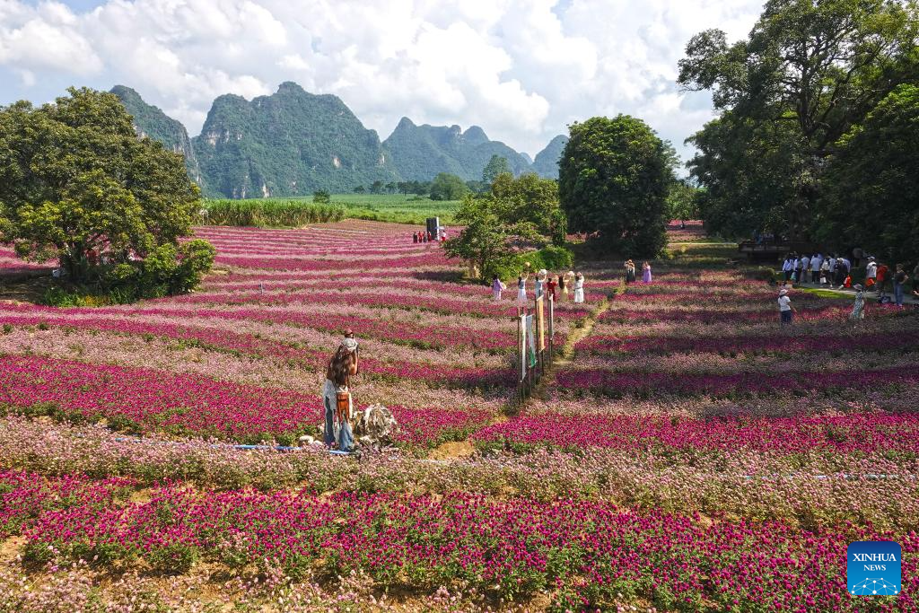 An aerial drone photo taken on Oct. 19, 2025 shows people enjoying the scenery of flower fields in Wuyi County of Jinhua City, east China's Zhejiang Province. People are heading outdoors to enjoy the pleasant autumn days across China. (Photo by Zhang Jiancheng/Xinhua)