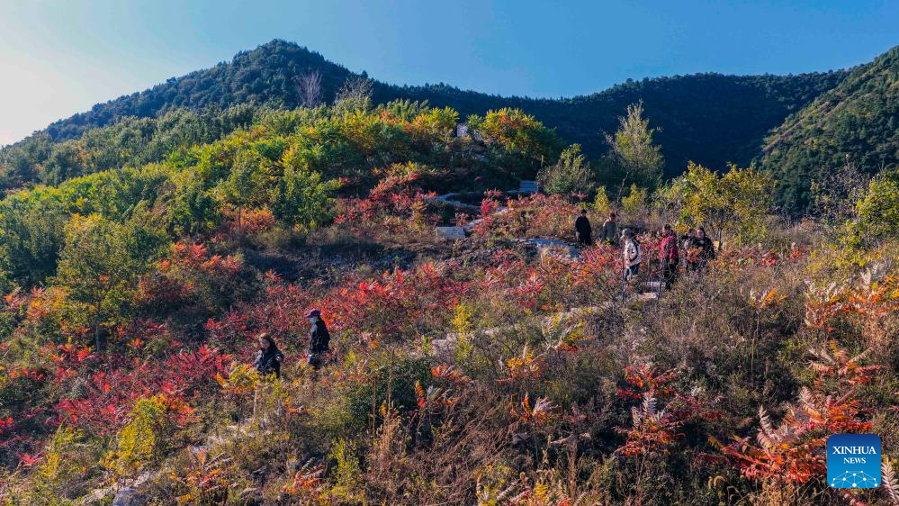 An aerial drone photo taken on Oct. 19, 2025 shows tourists visit a valley scenic area in Zunhua, north China's Hebei Province. People are heading outdoors to enjoy the pleasant autumn days across China. (Photo by Liu Mancang/Xinhua)