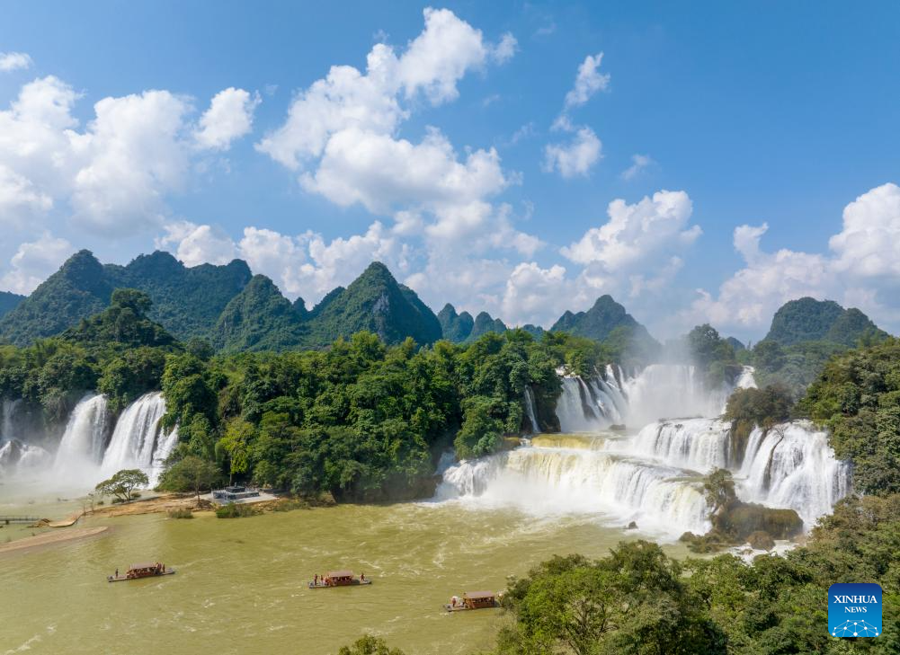 An aerial drone photo taken on Oct. 18, 2025 shows tourists taking a bamboo raft tour at Detian Waterfalls scenic area in Daxin County of Chongzuo City, south China's Guangxi Zhuang Autonomous Region. People are heading outdoors to enjoy the pleasant autumn days across China. (Photo by Liao Zuping/Xinhua)