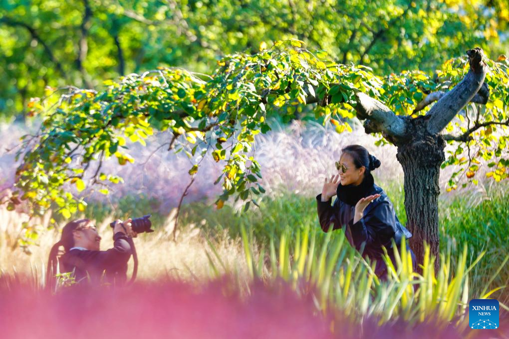 People pose for photos at a botanical garden in Binhai New Area, north China's Tianjin, on Oct. 19, 2025. People are heading outdoors to enjoy the pleasant autumn days across China. (Photo by Du Penghui/Xinhua)