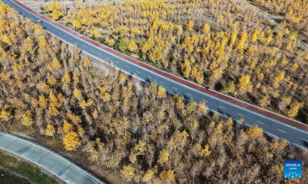An aerial drone photo taken on Oct. 19, 2025 shows a populus euphratica forest in Ganzhou District of Zhangye, northwest China's Gansu Province. People are heading outdoors to enjoy the pleasant autumn days across China. (Photo by Chen Li/Xinhua)