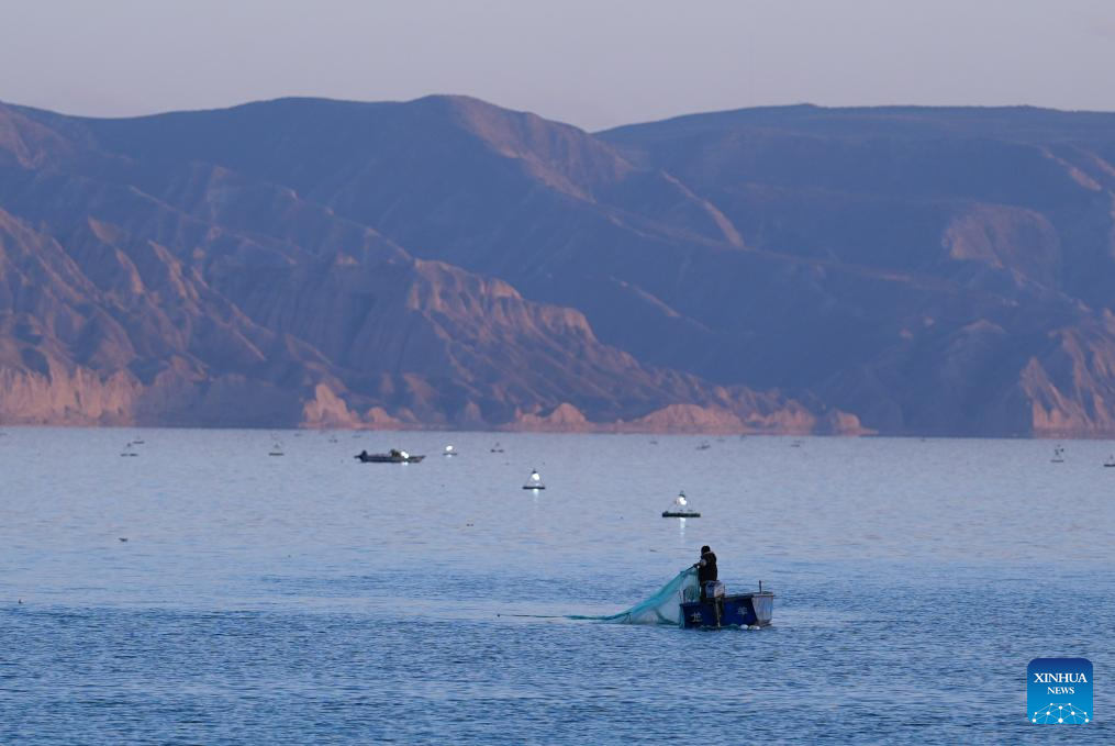 A fisherman casts a fishing net in the Longyang Gorge area in Gonghe County of Hainan Tibetan Autonomous Prefecture, northwest China's Qinghai Province, Oct. 17, 2025. Each year from late August to late November, fishermen in Longyang Gorge are busy harvesting silver fish.
