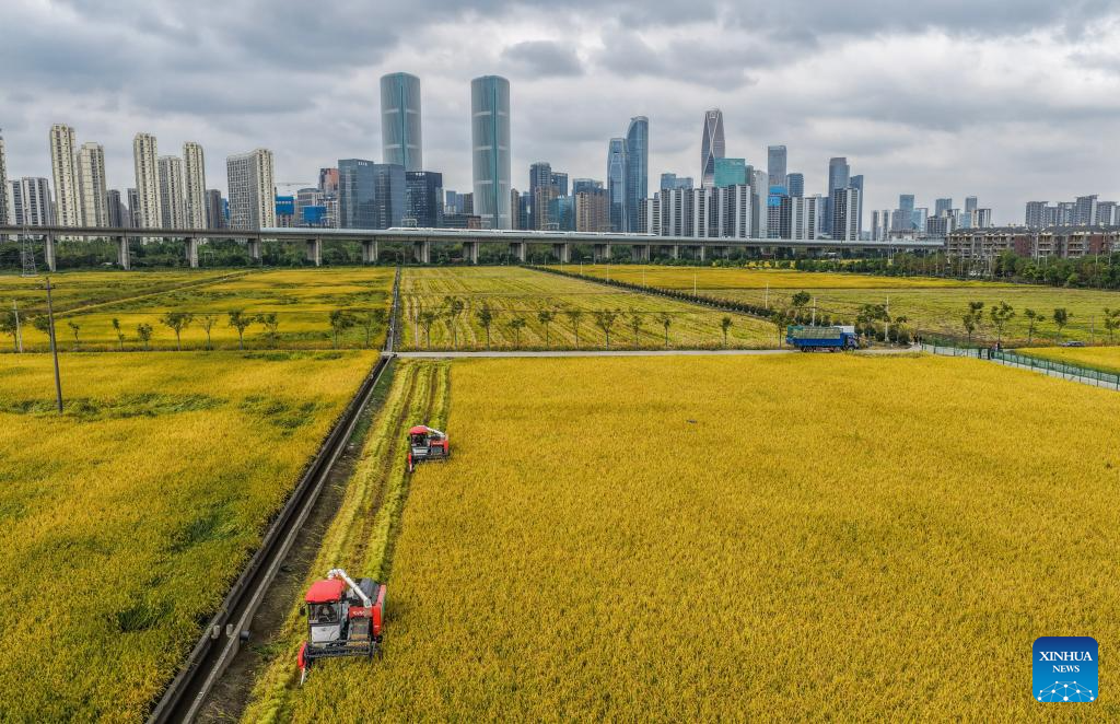 A drone photo taken on Oct. 21, 2025 shows harvesters harvesting rice in a paddy field, with a high-speed train in the background, in Hangzhou, east China's Zhejiang Province. (Xinhua/Xu Yu)