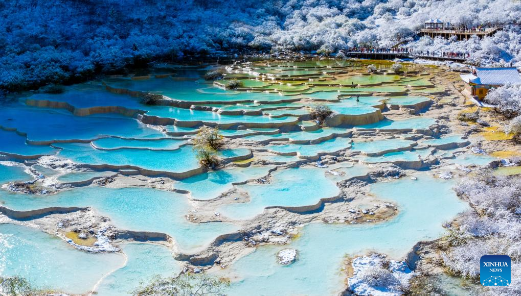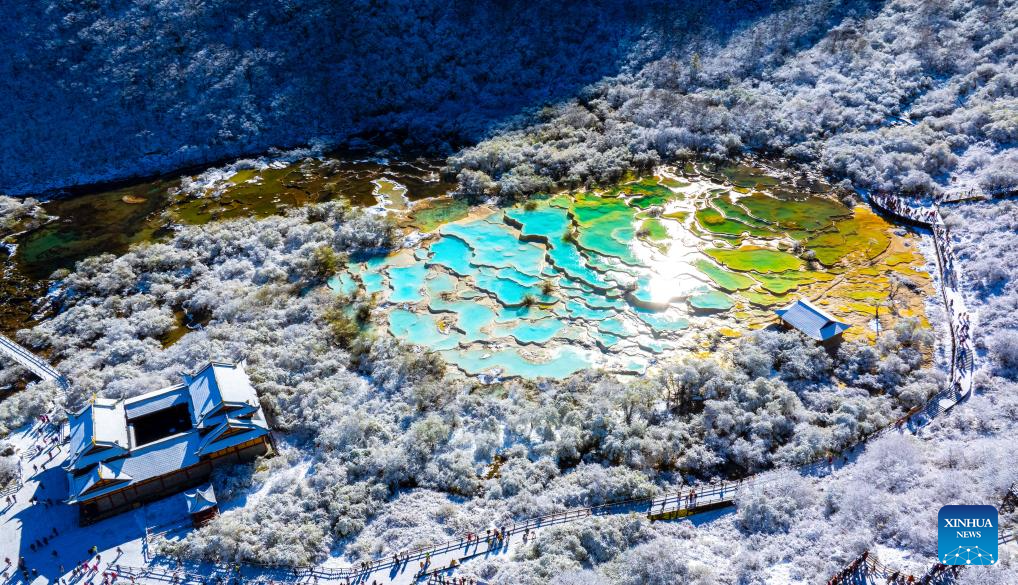 A drone photo taken on Oct. 21, 2025 shows a view of a colorful pond cluster after snow at the Huanglong scenic area in Aba Tibetan and Qiang Autonomous Prefecture, southwest China's Sichuan Province.