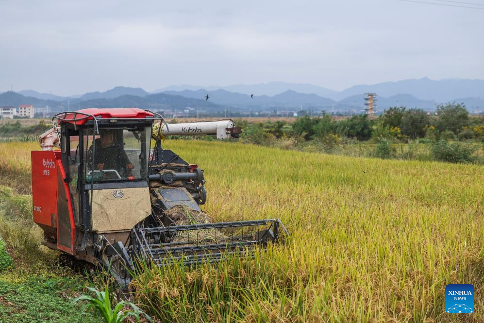 A reaper harvests paddy rice at a high-quality farmland demonstration area in Tangya Town of Jindong District, Jinhua City in east China's Zhejiang Province, on Oct. 22, 2025. (Xinhua/Xu Yu)