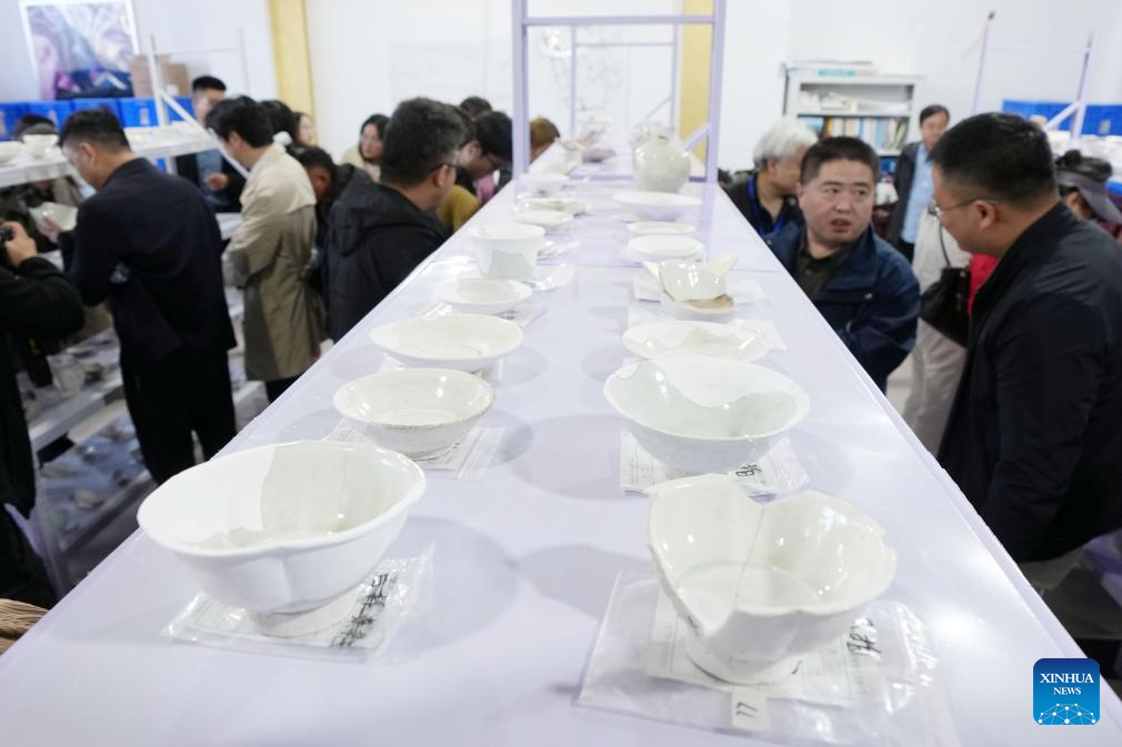 An archaeologist views samples of recently excavated white porcelain at the cultural relics storage room of the archaeologist team working on the remnants of the Suyukou kiln, in Yinchuan, capital of northwest China's Ningxia Hui Autonomous Region, Oct. 13, 2025. Remnants of the Suyukou kiln were discovered in 2017 in Yinchuan, capital of Ningxia, and cover an area of roughly 40,000 square meters. (Xinhua/Li He)