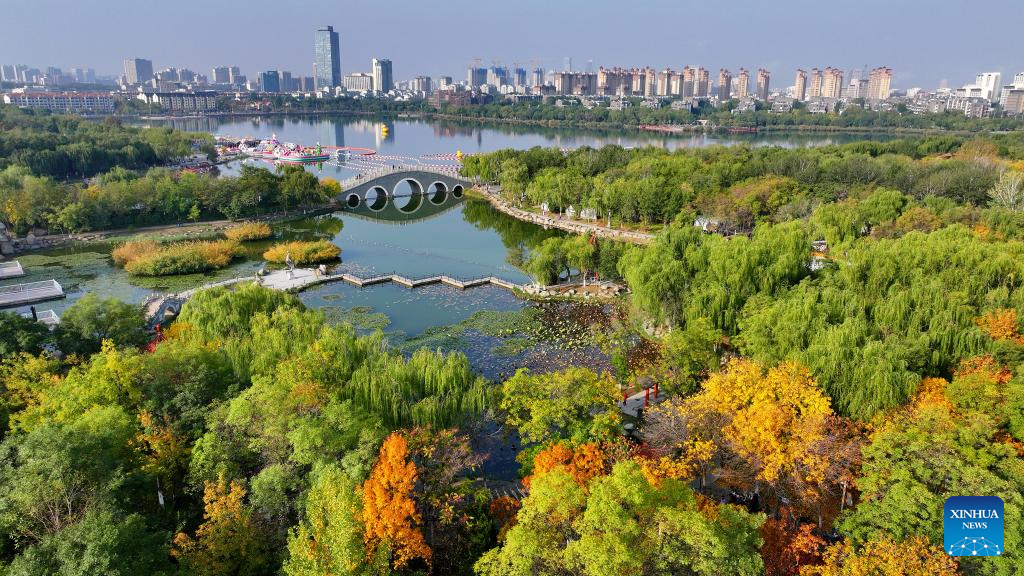 An aerial drone photo taken on Oct. 13, 2025 shows the autumn scenery of Haibao Park in Yinchuan, northwest China's Ningxia Hui Autonomous Region. (Photo by Li Jing/Xinhua)
