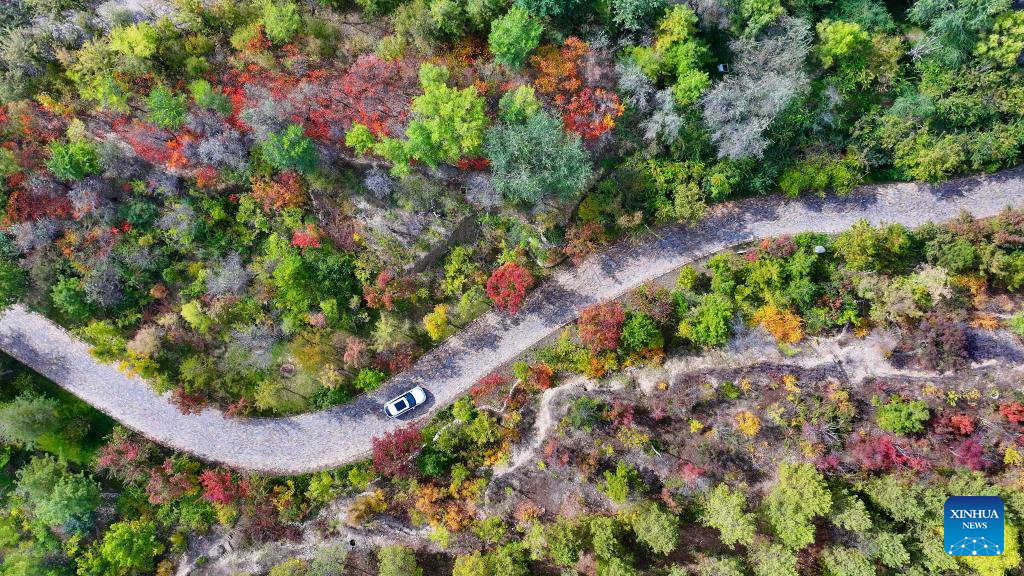 An aerial drone photo taken on Oct. 15, 2025 shows the autumn scenery of Haibao Park in Yinchuan, northwest China's Ningxia Hui Autonomous Region. (Photo by Li Jing/Xinhua)