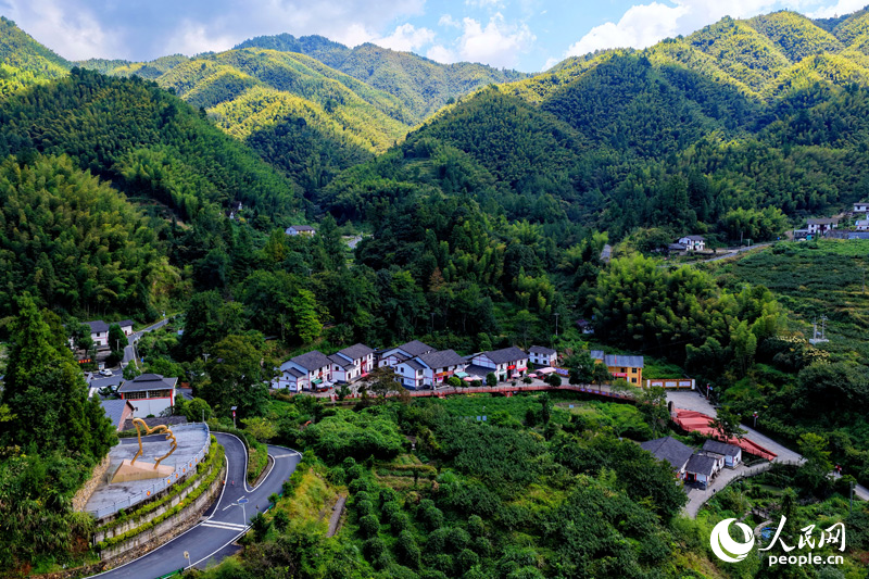 Photo shows an aerial view of Shenshan village in Maoping township, Jinggangshan city, east China's Jiangxi Province, where blue skies, green forests, beautiful farmhouses and smooth roads form a picturesque landscape. (People's Daily Online/Zhu Haipeng)