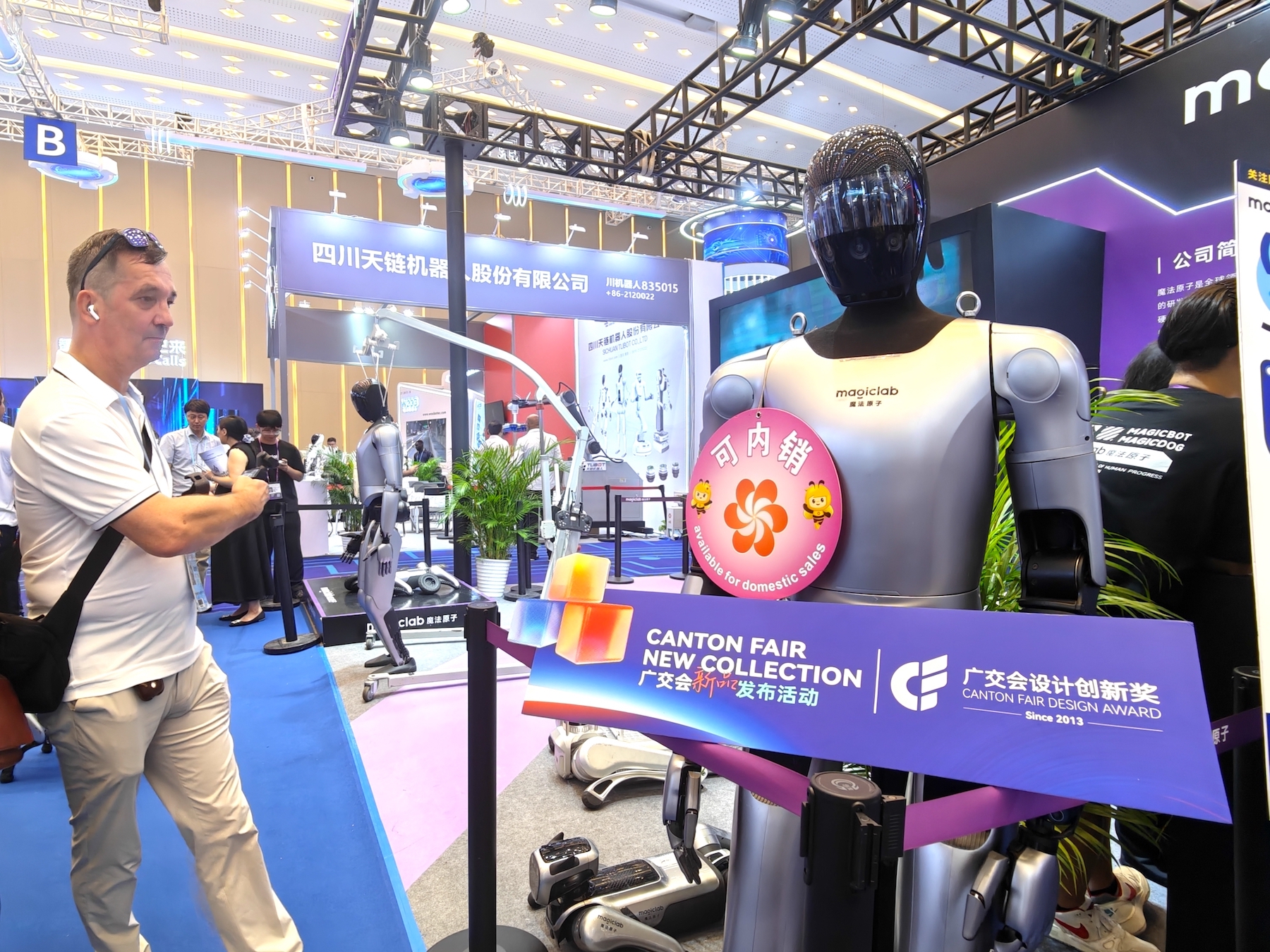 A robotic product holds a sign that reads "Available for Domestic Sales" at the 138th China Import and Export Fair, or the Canton Fair, held in Guangzhou, south China's Guangdong Province, on Oct. 15, 2025. (People's Daily Online/Wang Yadie)