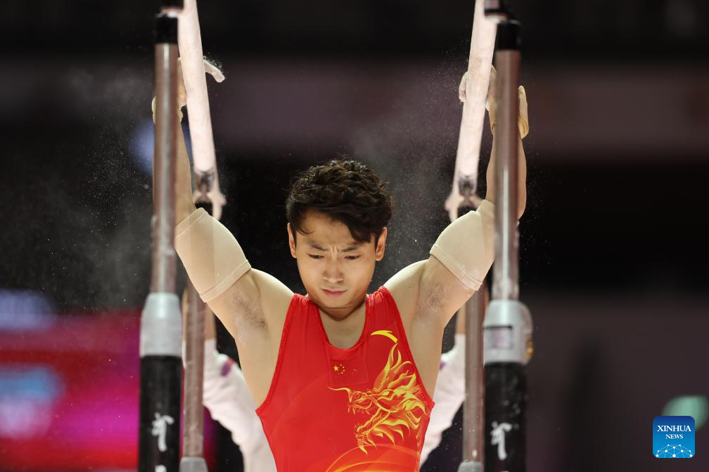 Zou Jingyuan of China prepares during the the Men's Parallel Bars Final at 53rd FIG Artistic Gymnastics World Championships in Jakarta, Indonesia, on Oct. 25, 2025. (Xinhua/Bai Xuefei)