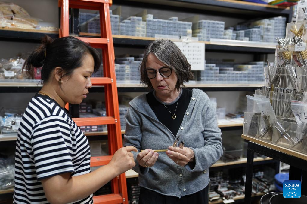 Christiane Toewe (R) selects tools for ceramics at a store in Jingdezhen City, east China's Jiangxi Province, Oct. 19, 2025. (Xinhua/Zhou Mi)