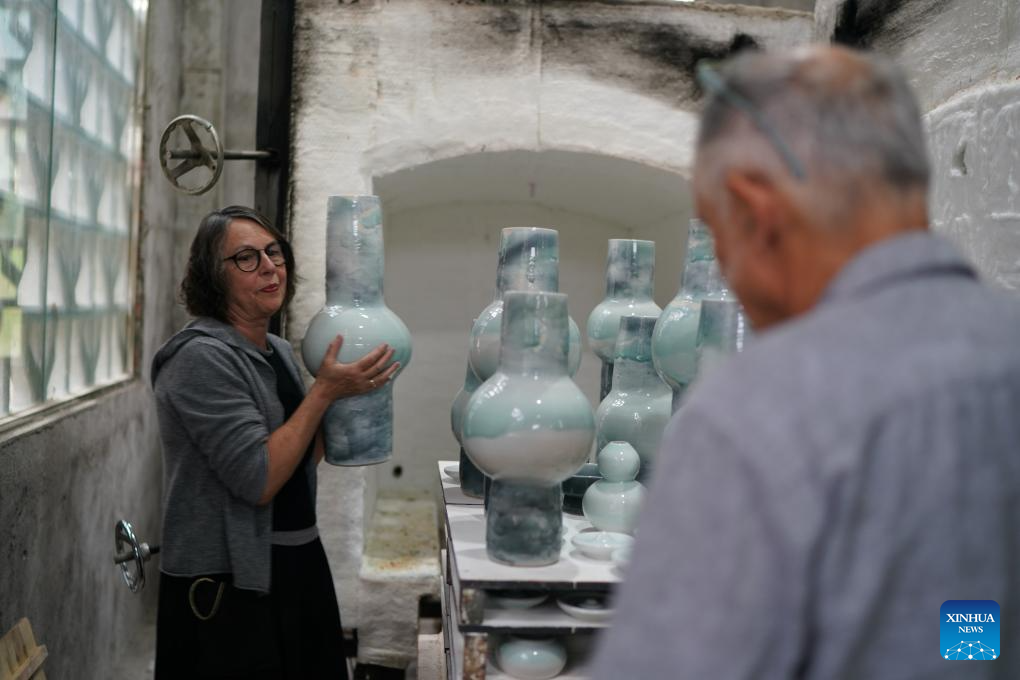 Christiane Toewe checks a ceramic work in Jingdezhen City, east China's Jiangxi Province, Oct. 19, 2025. (Xinhua/Zhou Mi)