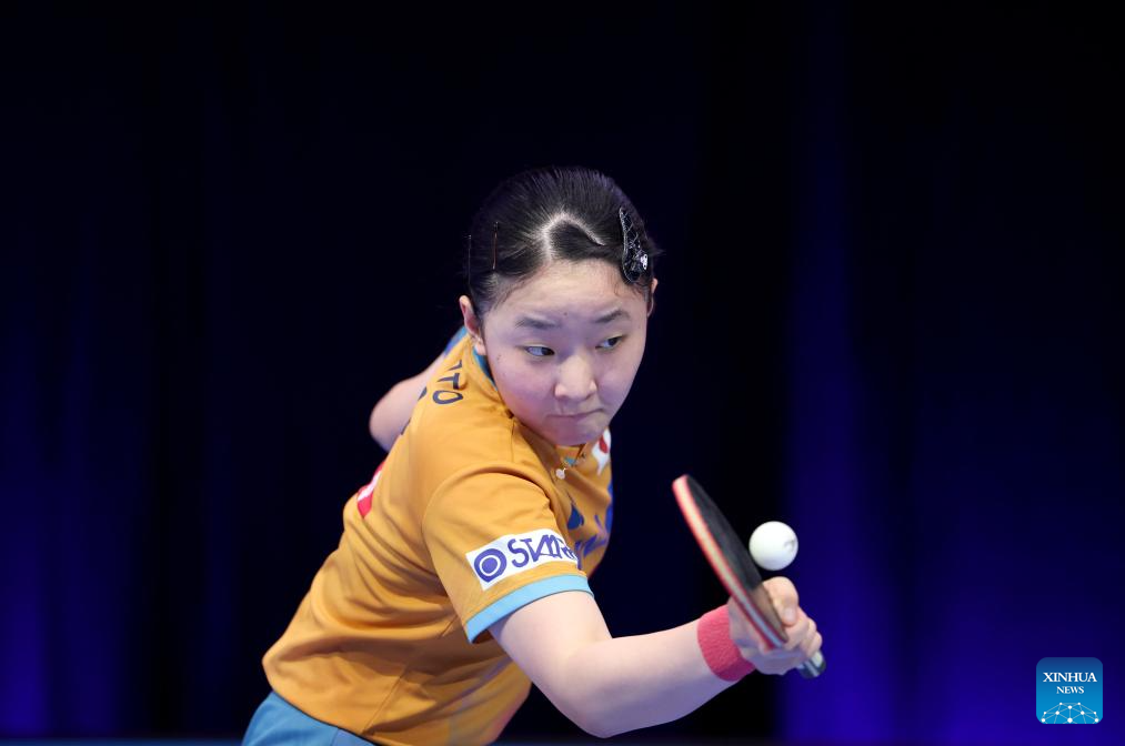 Yang Yiyun returns a shot during women's singles quarterfinal between Yang Yiyun of China and Harimoto Miwa of Japan in the WTT Star Contender London 2025 in London, Britain, on Oct. 25, 2025. (Xinhua/Li Ying)