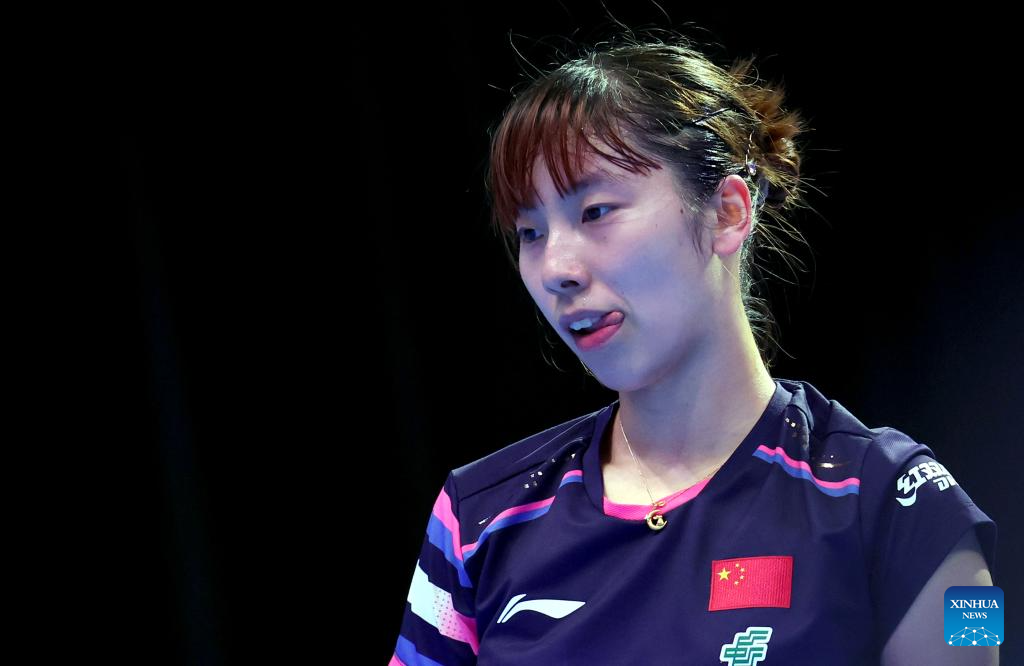 Yang Yiyun reacts during women's singles quarterfinal between Yang Yiyun of China and Harimoto Miwa of Japan in the WTT Star Contender London 2025 in London, Britain, on Oct. 25, 2025. (Xinhua/Li Ying)