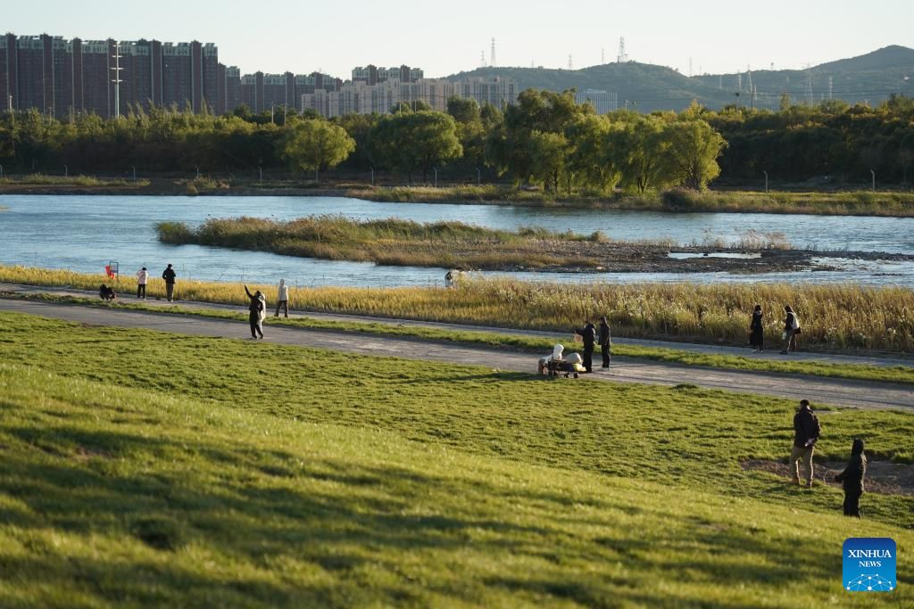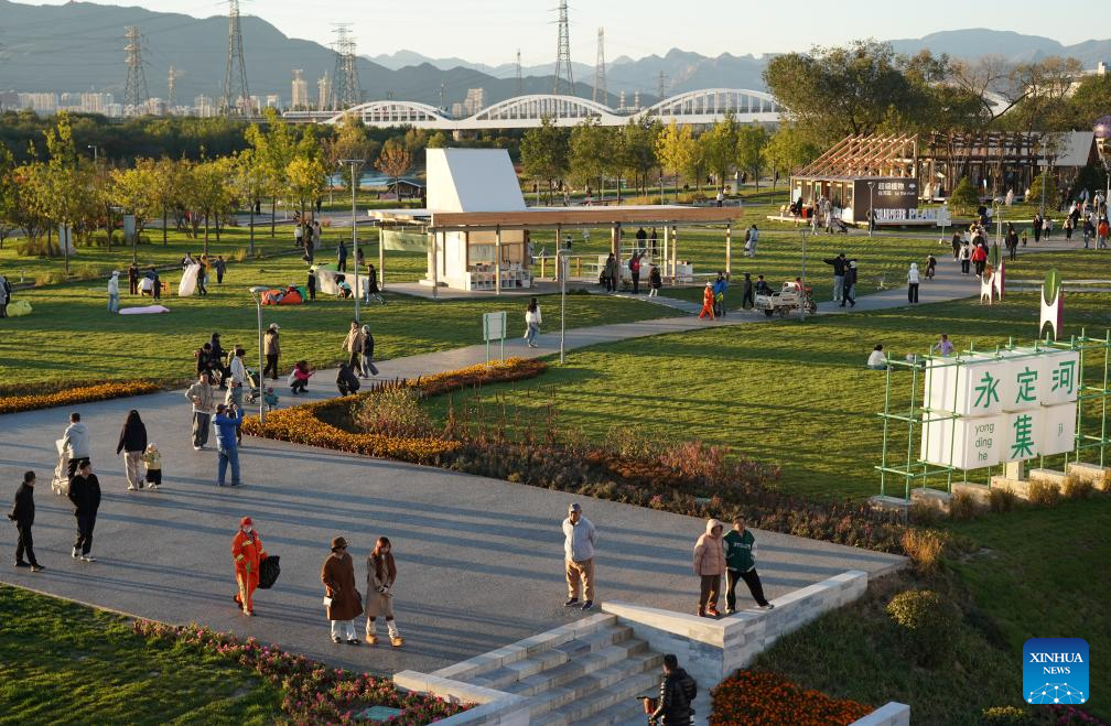 People enjoy themselves by the Yongding River in Shijingshan District of Beijing, capital of China, Oct. 26, 2025. (Xinhua/Zhang Chenlin)
