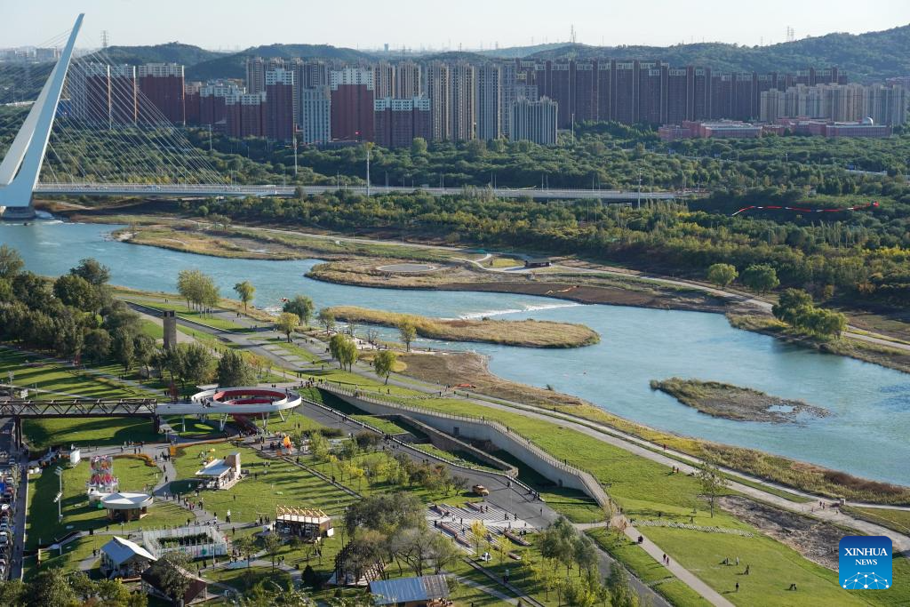 People enjoy the scenery along the Yongding River from a viewing platform in Shijingshan District of Beijing, capital of China, Oct. 26, 2025. (Xinhua/Zhang Chenlin)