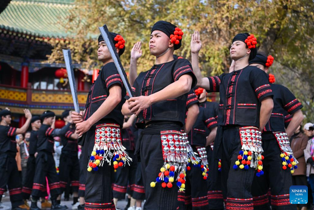 Performers from a Yunnan dance and opera troupe perform during a flash mob event at Renmin park in Urumqi, northwest China's Xinjiang Uygur Autonomous Region, Oct. 27, 2025. A flash mob event featuring ethnic dances was held here on Monday. (Xinhua/Ding Lei)