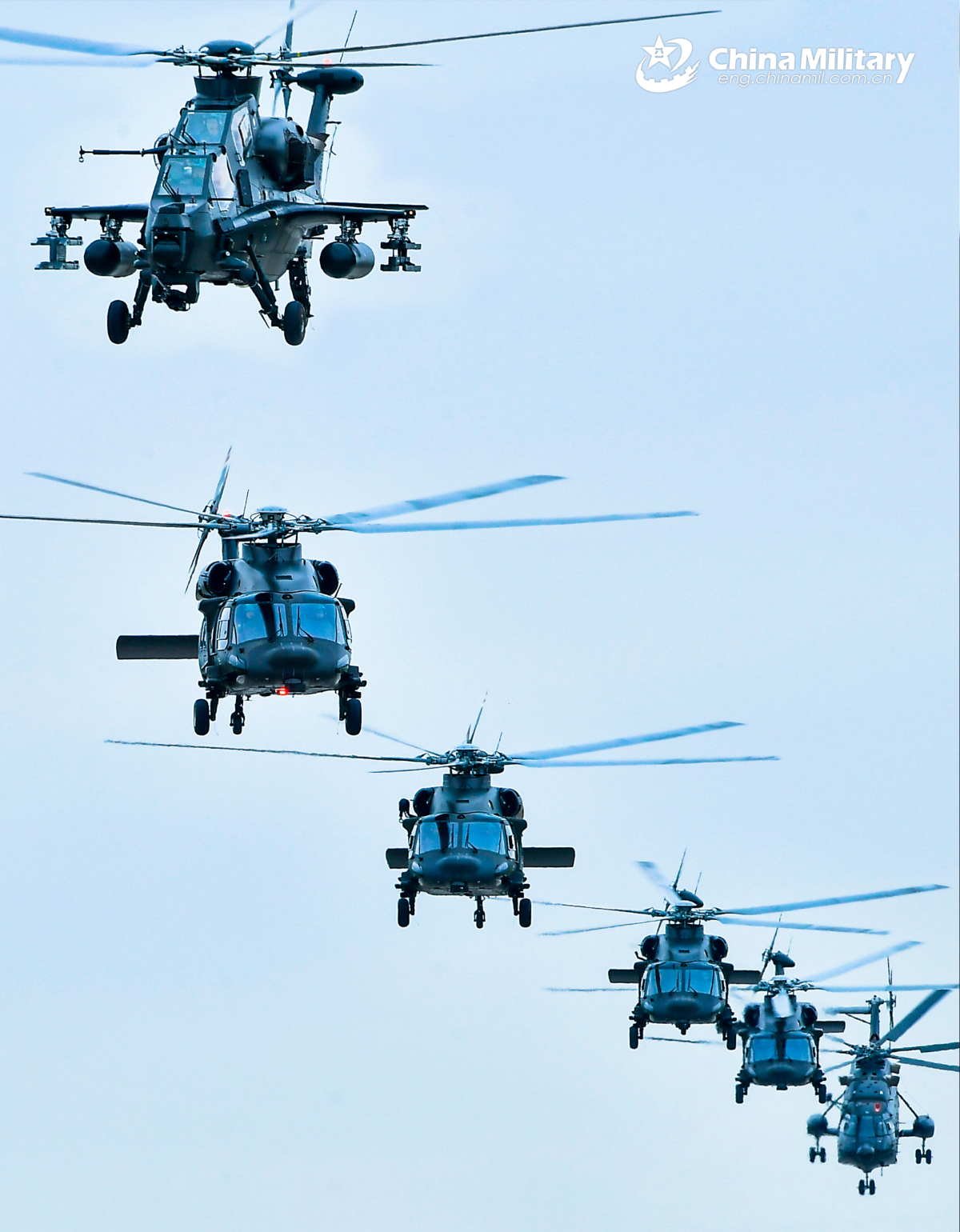 Helicopters attached to a brigade under the Chinese PLA Eastern Theater Command maneuver to the designated area during a multi-subject flight training exercise on September 12, 2025. (eng.chinamil.com.cn/Photo by Zhang Mao)