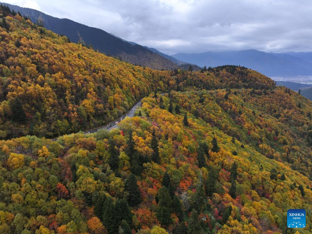 An aerial drone photo taken on Oct. 28, 2025 shows the autumn scenery of Serkyim La Mountain in Nyingchi, southwest China's Xizang Autonomous Region. (Xinhua/Lu Danyang)