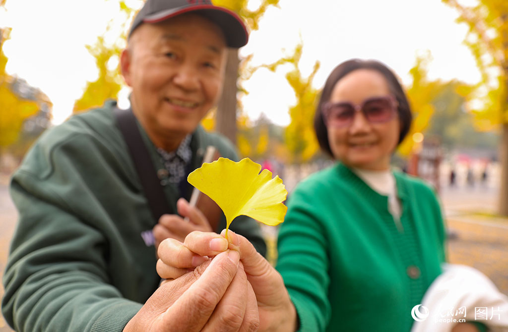 An elderly couple holds an autumn-colored ginkgo leaf at the Jinci Temple Museum in Taiyuan, north China's Shanxi Province on Oct. 24, 2025. (People's Daily Online/Wang Fan)