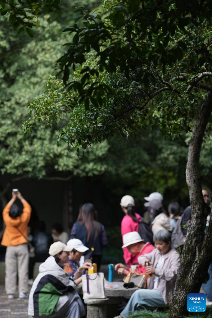 Tourists enjoy their meal under osmanthus trees at Manjuelong Village in Hangzhou, east China's Zhejiang Province, Oct. 29, 2025. Recently, osmanthus flowers in Hangzhou have entered blooming period. More than 5 million osmanthus trees are planted across the city, according to local authorities. (Xinhua/Huang Zongzhi)
