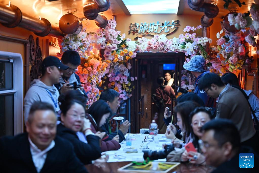 Passengers enjoy themselves inside a themed carriage of the Tianjin Fantasy Express train in north China's Tianjin, Oct. 30, 2025. The Tianjin Fantasy Express, China's first passenger train dedicated to immersive cultural tourism, officially began operation on Thursday. The train features 10 distinctively themed carriages and song and dance performances. It currently operates on a scheduled round-trip service between Tianjin North Railway Station and Jizhou North Railway Station. (Xinhua/Li Ran)