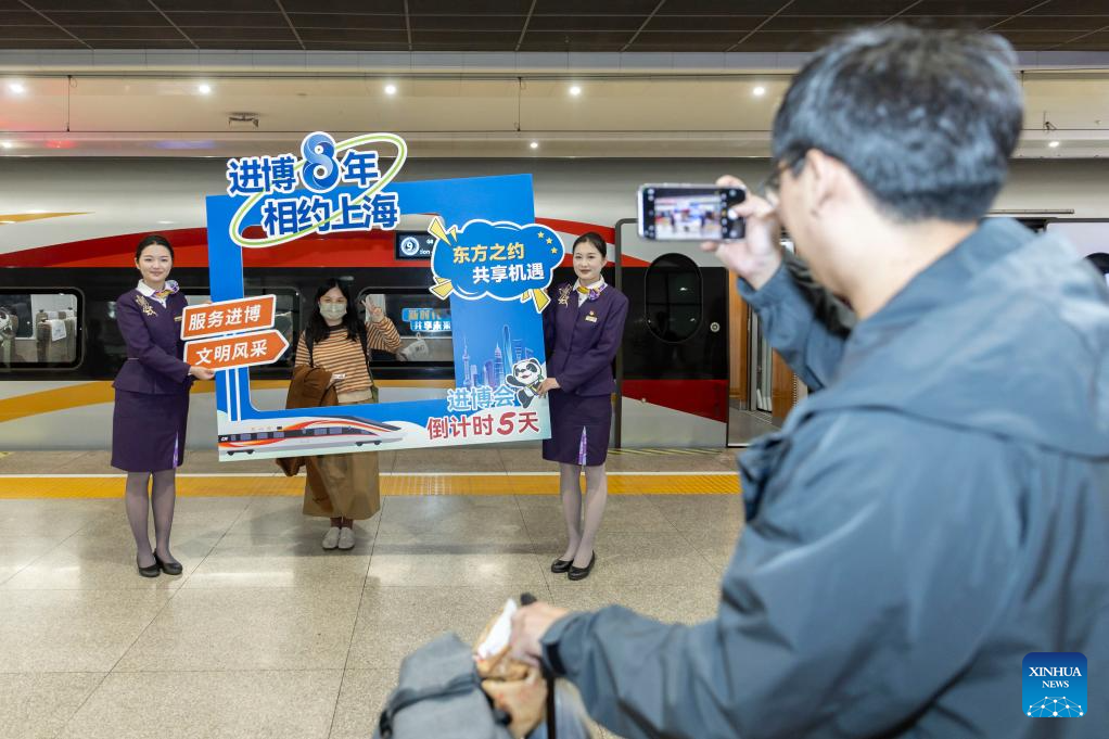 Passengers and train attendants pose for a photo with a countdown board for the 8th China International Import Expo (CIIE) at Shanghai Hongqiao Railway Station in east China's Shanghai, Oct. 30, 2025. China Railway Shanghai Group Co., Ltd. launched a themed activity here on Thursday, introducing highlights of the upcoming CIIE to passengers aboard the high-speed railway train G8. (Xinhua/Wang Xiang)